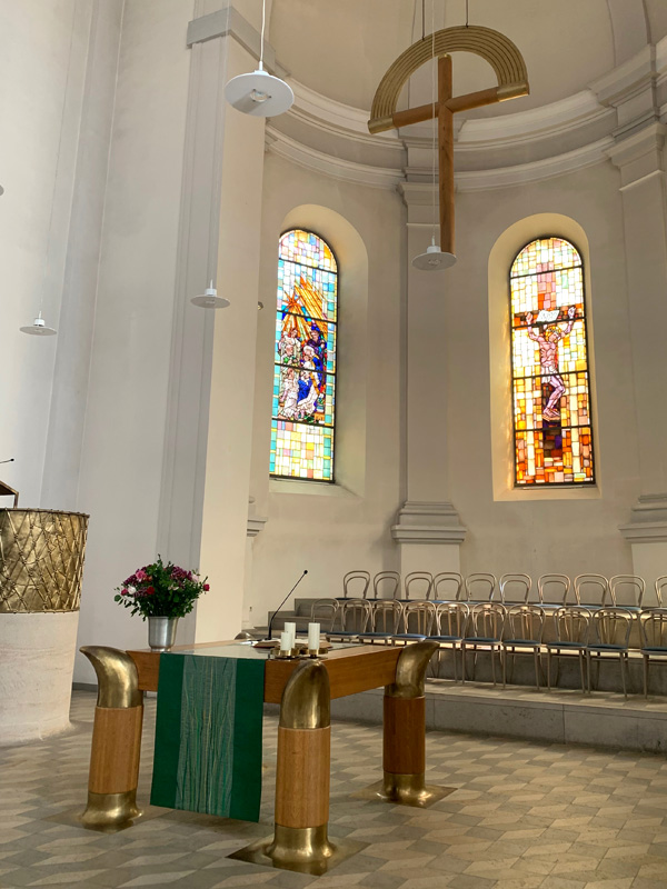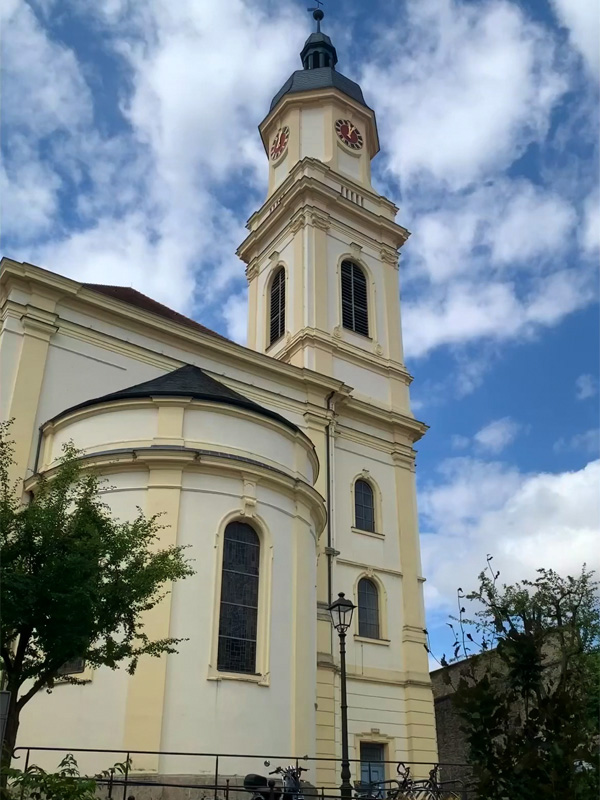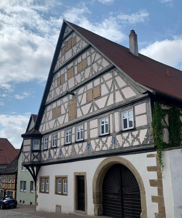 Der zweite Tag. 27.07.2022. Nachdem ich mich vom Royal-Enfield Floh verabschiedet hatte fuhr ich morgens durch das herrliche Main-Taubergebiet bis nach Uffenheim. Die Landschaft war teilweise so fernab und verwunschen, dass mein Navigationshandy streckenweise komplett ausstieg und ohne Empfang war. Uffenheim aber bot sich als ein wunderschöner Ort in barockem Baustil. Ich hatte mein Motorrad in einer kleinen Gasse, gleich vor einem Eiskaffee in der Fußgängerzone im alten Stadtkern geparkt und entschloß mich hier zu verweilen. Ich schlenderte durch die Gassen alter Fachwerkhäuser, liebevoll mit Ornamenten verziert, als ich ein leises Orgelspiel aus einer in einem Gelbton erscheinenden evangelischen Kirche vernahm. Ich öffnete die Kirchentür und hörte wie ein Organist: „Danke, für diesen guten Morgen“, probte. Nach einer Weile meines andächtigen Lauschens bemerkte er mich im Kirchraum, gerade war ich im Begriff die Kirche wieder zu verlassen, da winkte er mich hoch zu sich auf die Empore zu kommen. Dort erzählten wir munter über Orgelspiel und Posaunenchor. Auch er war eine Zeit seines Lebens Posaunist gewesen, habe sich aber schließlich für das Orgelspiel entschieden. Zum Abschluss spielte er mir noch einen kleinen klassischen Satz vor und ich bedankte mich von ganzem Herzen und verabschiedete mich.