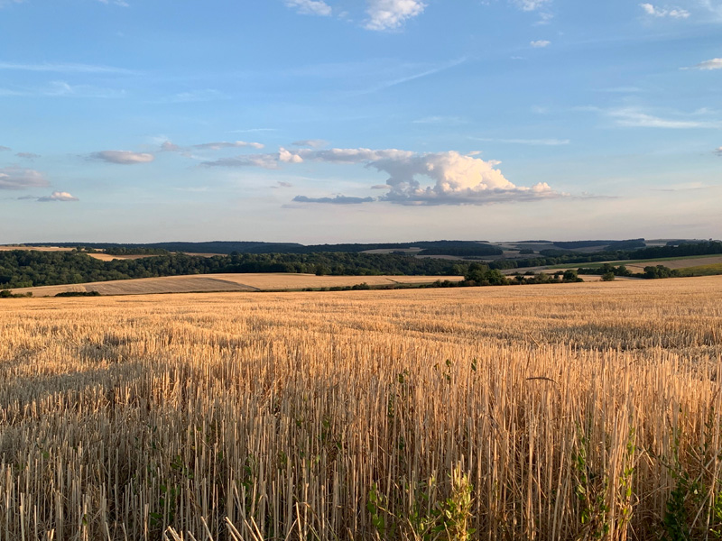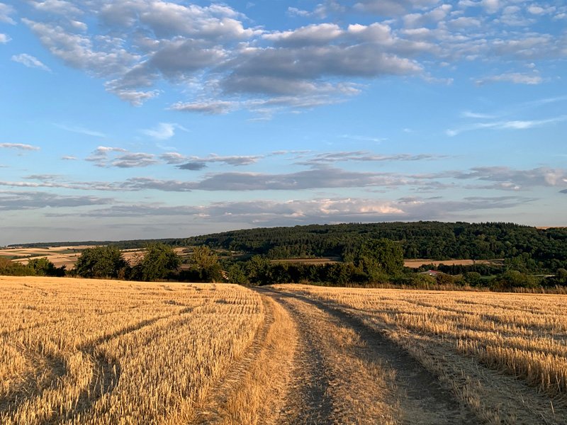 Am Nachmittag dann in Ansbach angekommen erlebte ich ebenfalls eine wunderschöne Barockstadt mit einem großen Marktplatz und einer Basilika. Dort aß ich bei einem knurrigen alten Franken, der eine thailändische Frau kochen ließ, zu Mittag. Es war 20 Minuten vor 14:00 Uhr und er wies mich darauf hin, dass er um Punkt schließen würde. Das Restaurant war aber noch voll besetzt und es kam auch noch ein Gast um 10 vor Punkt. So aß und genoss ich mein Thai-Curry bis er mich schließlich ermahnte, er würde gleich schließen. "Er habe ja auch mal Mittagspause", raunzte er. Dennoch verweilten auch noch andere Gäste und er knurrte sie alle förmlichst hinaus und schloss hinter sich die Tür. Meine Herberge für die Nacht fand ich dann in Eichstätt. In einem kleinen Hotel am Waldrand im romantischen Altmühltal und genoss noch bei frischer Waldluft ein gutes bayrisches Helles. Zum Abend stieg ich über Wiesen auf eine Anhöhe vor dem Hotel um noch ein paar Schritte vor dem Zubettgehen zu tun und meine schönen Erlebnisse revuepassieren zu lassen.