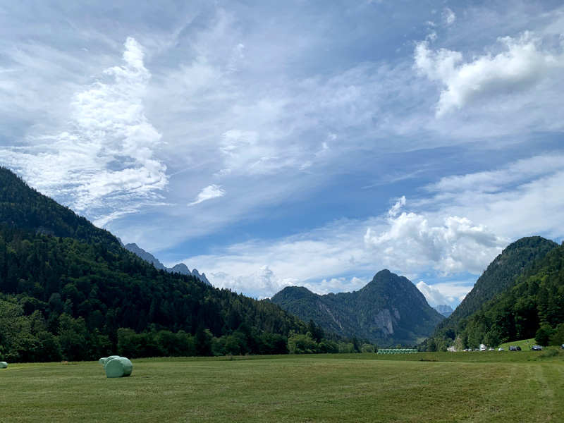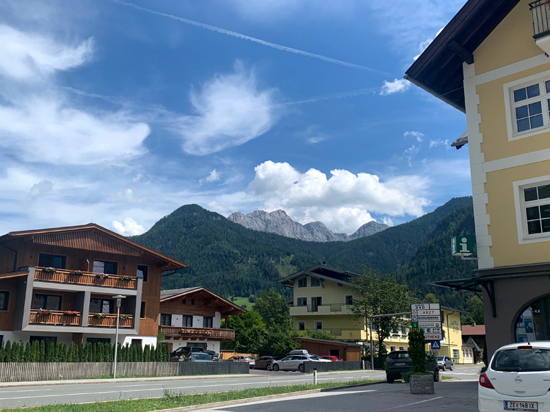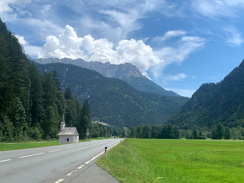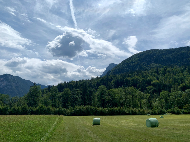 Draußen vor dem Landgasthof hatten sich schon einige Gäste eingefunden und Platz genommen. Eine pfundige Bayerin bediente und brachte mir eine leckere Forelle Müllerin und ein frisch gezapftes Helles. Ein ausgedehnter Abendspaziergang führte mich später zu einer auf einem kleinen Berg gelegenen Dorfkirche mit einem angrenzenden Friedhof. Dort verweilte ich eine stille Zeit. Als ich schon im Dunkeln zurück zum Hotel kam schallte aus dem großen Saal im Erdgeschoss laute Tanz- und Partymusik. Wegen Corona hatte die Dorfjugend ihren Abschlussball nicht feiern dürfen. Das wurde am heutigen Sommerabend mit Schwung und guter Laune nachgeholt. Aus einer ruhigen Nacht wurde dann leider nichts. Meine Müdigkeit holte mich aber bald in den Schlaf. Am nächsten Morgen überlegte ich ob ich nicht dort eine weitere Nacht verweilen sollte, aber es war Regen angesagt und ich wollte noch bis Zell am See kommen bevor es sich einregnete. Die Ruhe und Idylle auf dem Land taten mir gut. Dennoch reiste ich ab und war so glücklich als ich am Horizont, kurz vor Salzburg, endlich die majestätischen Alpen erblickte.