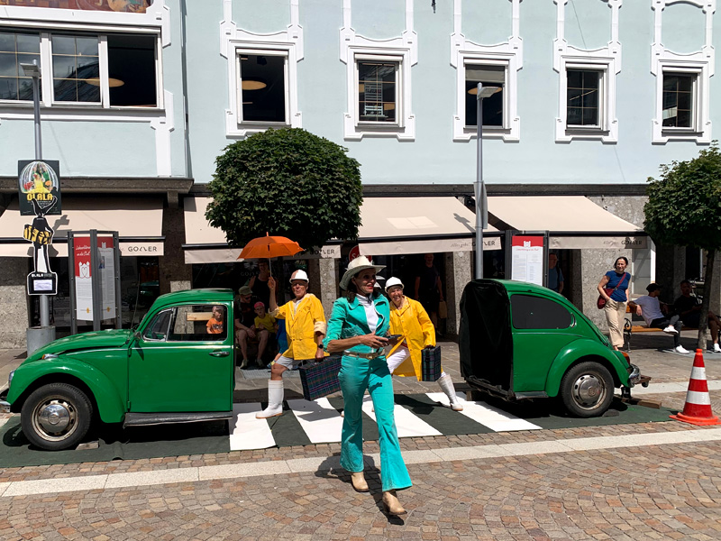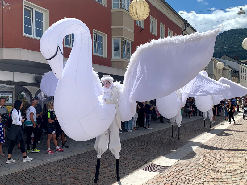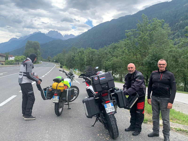 Fünfter Tag am 30.07.2022 Ich wartete den Regen ab und fuhr dann gegen 11:00 Uhr vormittags Richtung Mittersill über den Felbertauern-Pass bis Lienz. Die Felbertauern begrüßten mich mit strömendem Regen und forderten mir einige Fahrkünste ab die Serpentinenkurven vorsichtig entlang zu hangeln ohne mit den Rädern weg zu rutschen. Die von dichtem Nebel umhüllten Berge vermittelten einen geheimnisvollen Eindruck. Glücklich in Lienz angekommen gönnte ich mir bei sommerlichem Wetter eine ausgedehnte Pause. Die Sonne sollte meine Kleidung wieder trocknen und ich zog mein Regenzeug aus, hängte meine nassen Schuhe über den Lenker, die nassen Socken über die Spiegel und ging in Sandalen, Motorradhose und T-Shirt, etwas peinlich aber zumindest etwas sommerlich gekleidet in die Innenstadt um eine kleine Stärkung zu mir zu nehmen. In Lienz fand gerade an diesem Samstag ein Kleinkunstfestival statt, für mich eine willkommene Abwechslung. Majestätisch anmutende Riesenschwäne spazierten mit Musikbegleitung durch die Innenstadt. Andere mimten die Beatles auf dem berühmten Zebrastreifen in der Abbey Road. Natürlich durfte eine Wahrsagerin nicht fehlen. Mit einem älteren Herrn kam ich über Motorräder ins Gespräch, er war stolzer Besitzer einer alten Puch mit 250 cm3. Er warnte mich vor den Italienern die die günstigen Spritpreise nützen würden, ihren Tank überfüllten und anschließend über den Plöcken-Pass zurück nach Italien fuhren. Dort würde der überfüllte Tank überflüssiges Benzin auf die Straße tropfen lassen und den Asphalt in eine spiegelglatte Fläche verwandeln. Ich nahm seinen Rat gerne an, kleidete mich wieder in meinen, mittlerweile getrockneten, Motorradanzug und verließ Lienz mit einem recht positivem Eindruck über die letzte Stadt in Österreich vor der italienischen Grenze. Da der Plöcken-Pass nach Italien aber in Sonnenschein getauft war, gestaltete sich die Straße trocken und es gab keine spiegelglatten Flächen verursacht durch auslaufendes Benzin. Oben angekommen überschritt ich die italienische Grenze.