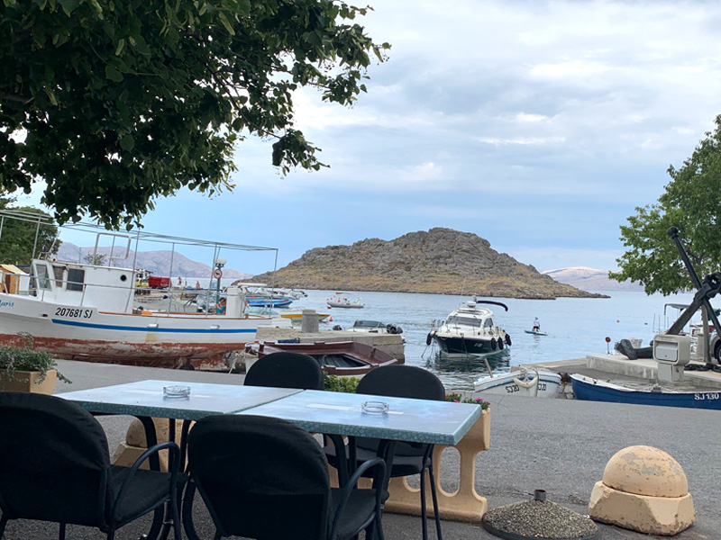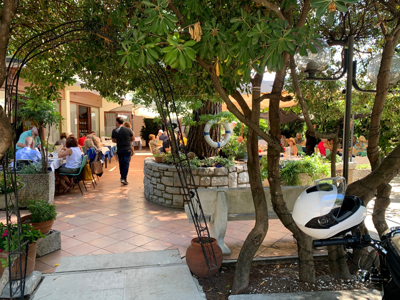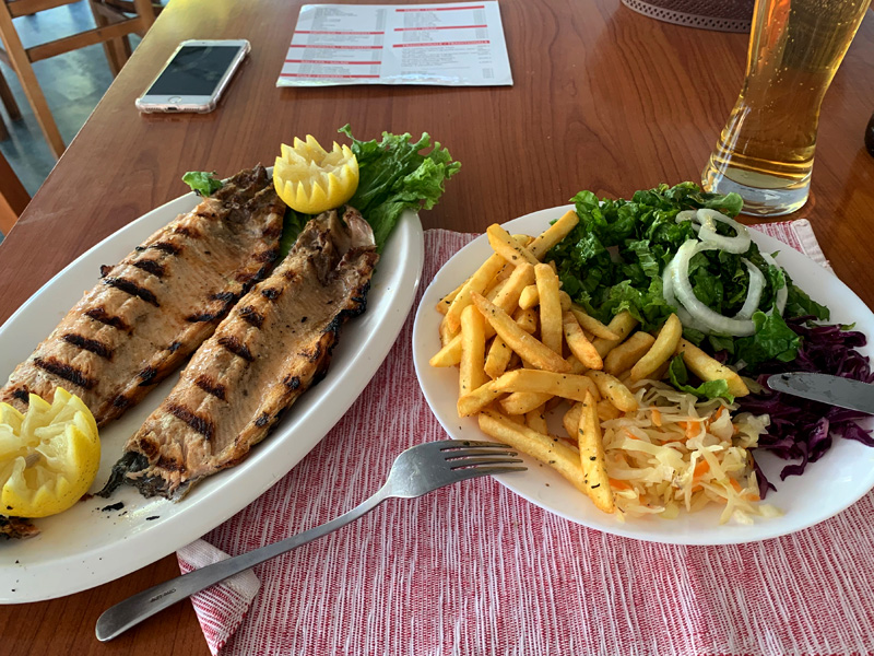 Freitagabend gingen wir in Larissas in der schöner Altstadt spazieren, besuchten eine Ausgrabungsstätte eines Kolosseums und betrachteten das Amphietheater in Larissa. Wir bummelten noch ein wenig durch die Stadt und aßen einen kleinen Salat beziehungsweise die beiden eine Pita gefüllt mit Pommes oder Gyros. Die Gassen waren gefüllt mit feiernden Menschen. Gerade die griechischen Girls suchten nach Aufmerksamkeit mit ihren modernen Outfits. Samstagabend fuhren wir nach Plata Mona. Ein buntes Treiben, mit Shops und Restaurants versüßte uns den Abend. In der kleinen Basilika am Meer stellten wir Kerzchen für unsere Familien auf. Geistliche, griechische Musik begleitete das Feuer der Kerzen. Auf dem Speiseplan von Gudi und Kosta stand Beef teki mit Pommes. Das würden sie am liebsten essen. Ich verzehrte ein paar sehr leckere Gambas mit Salat und Patatas. Wir teilten uns ein Bier.