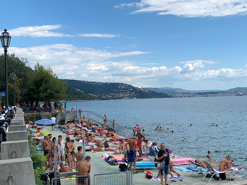 Am sechsten Tag. 31.7.2022. Über Tolmezzo, Udine und Monfalcone steuerte ich die italienische Hafenstadt Triest an, Tor nach Slowenien, Kroatien und das Mittelmeer. In Monfalcone aß ich in einem vorzüglichen Restaurant mit großzügiger Gartenterasse zu Mittag. Es war Sonntag und die italienischen Familien hatten Tische reserviert für ihre, Kinder, Eltern und Großeltern. Die äußerst attraktive Kellnerin lehnte mich vorerst ab, es sei alles ausgebucht. Mit leidvollem Gesichtsausdruck erklärte ich ihr, dass ich nur eine Person sei und dass ich großen Hunger vom Motorradfahren mitbringen würde. Dann verschwand sie und ein junger Kellner gewährte mir Einlass. Ich musste allerdings innen im Restaurant Platz nehmen. Das war mir ganz lieb da ich ja den ganzen Tag auf der Straße war. Noch einen Espresso zum Abschied und ich setzte meine Fahrt fort in die große Hafenstadt Triest. Schon durch die Bäume hindurch und später direkt von der Küstenstraße aus sah ich das Mittelmeer. Unglaublich weit und schön breitete es sich vor mir aus. Ich war so glücklich diesen weiteren Schritt ohne Schaden geschafft zu haben. Immerwieder betete ich still und dankte Gott für eine behütete Tour. Schon fuhr ich vorbei an unzähligen Autos und Scootern die an der Küstenstraße parkten und irgeneinen Eingang suchten um ans Meer zu gelangen.