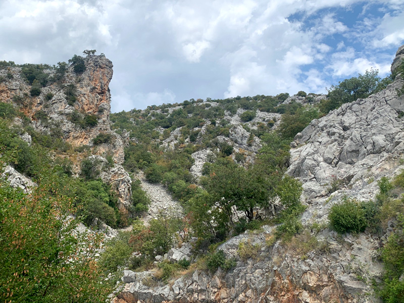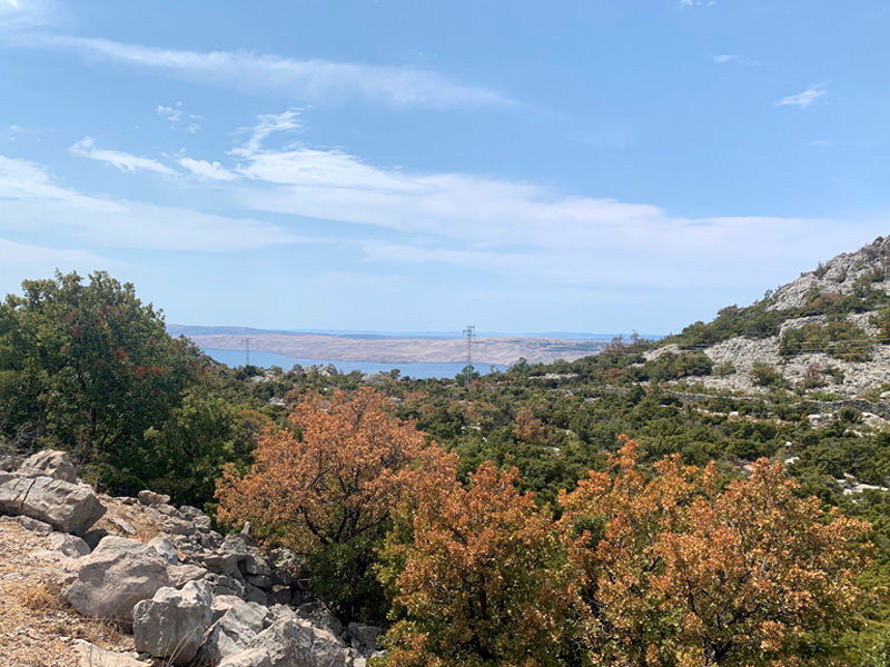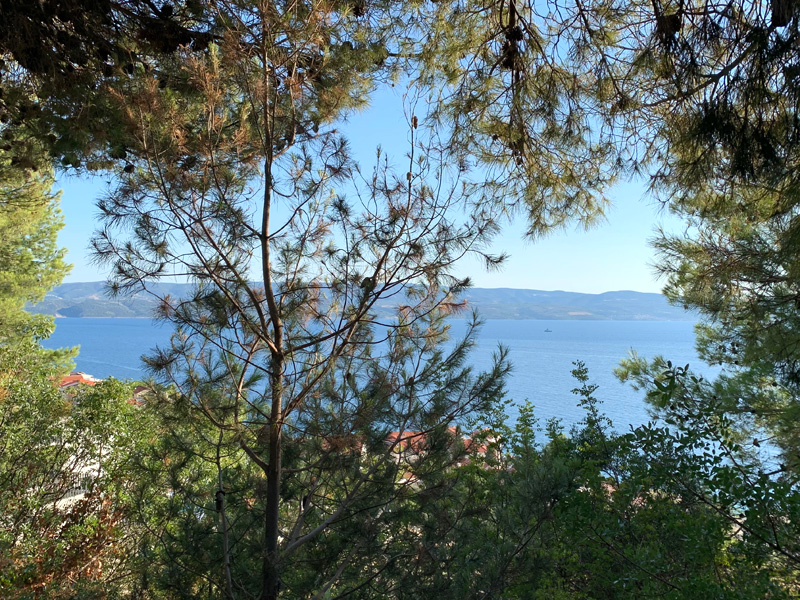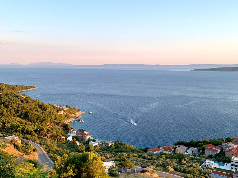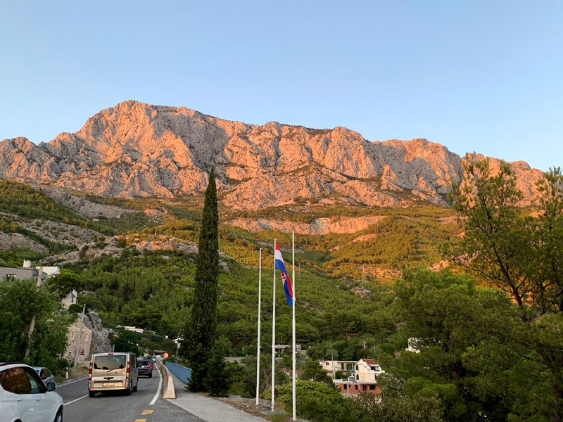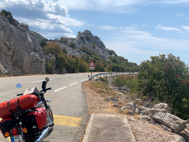 Der neunte Tag. 3. August 2022 Eine wunderschöne Tour entlang der kroatischen Küste verzauberte mir die Seele. Vorbei an herrlichen kleinen Buchten und Dörfern, die Felsen auf der linken Seite, Gebirge wo auch Karl Mays „Winnetou“ gedreht worden ist und auf der rechten Seite das blaue Meer, zu schön. Ich genoss ein herrliches Abendessen an einem schönen Badeort und fand einen Zeltplatz zur Übernachtung im Schatten von hohen Felsen. Dort lernte ich ein deutsches Pärchen kennen, meine Zeltnachbarn, die bis über beide Ohren voll mit Fahrzeugen ausgestattet waren. Ein Mercedes Bus diente als Zugmaschine, ein Wohnwagen diente zur Übernachtung und Wohnen, ein Motorrad um von dort aus Touren zu unternehmen, zwei Mountainbikes, und ein Stand Up Paddel zum Paddeln auf dem Meer. Sie war Lehrerin, er arbeitete in der Industie in leitender Position, einzige Tochter war bereits aus dem Haus und so gönnte man sich halt eine Materialschlacht für den Aktivurlaub. Leider konnte ich an diesem Platz nicht gut schlafen, der Strand war zugebaut mit alten Sozalistenbauten und nicht angenehm um dort zu verweilen. Ein Frühstück zu bekommen war leider zwecklos. Trotz Müdigkeit und Hunger startete ich am nächsten Morgen zur nächsten Etappe.