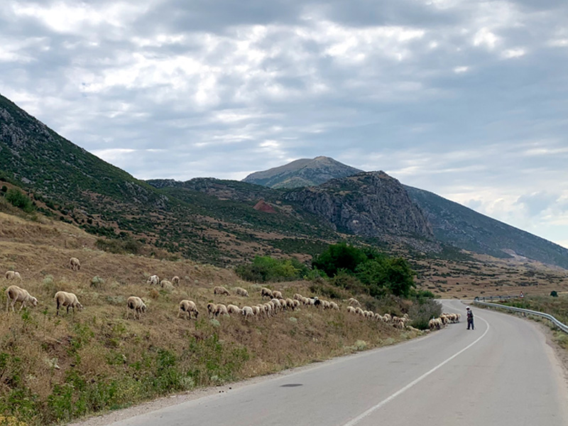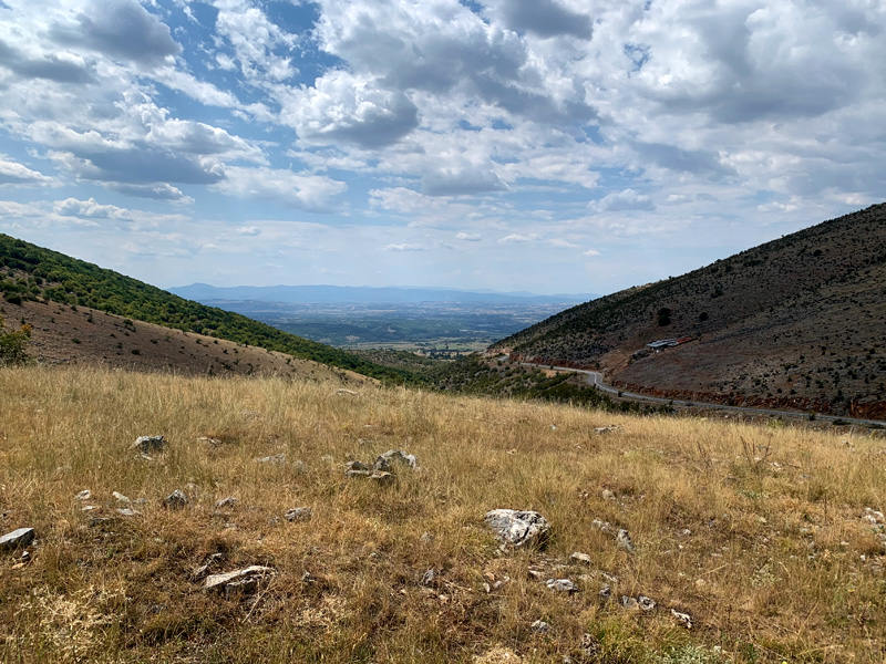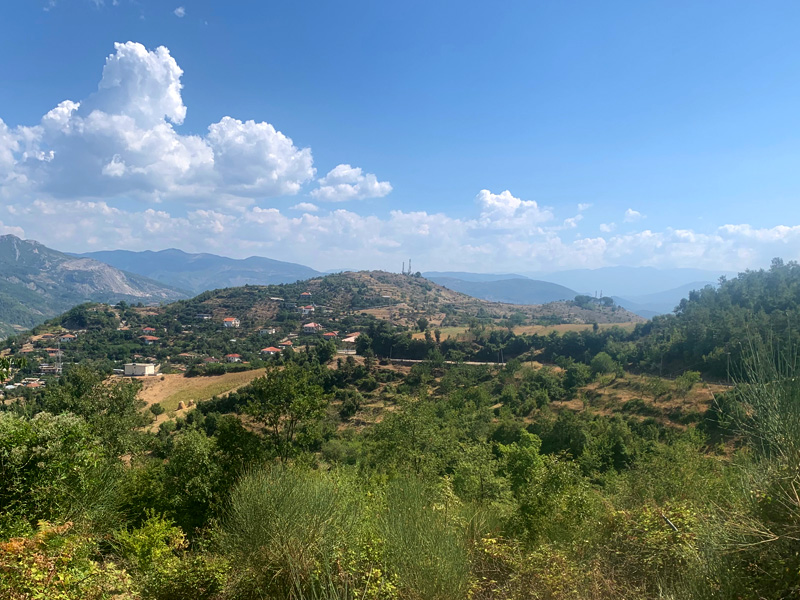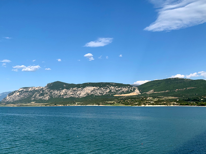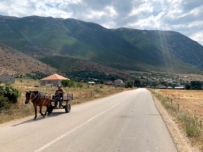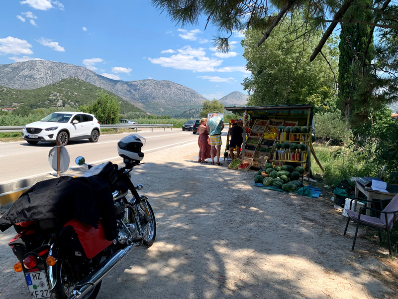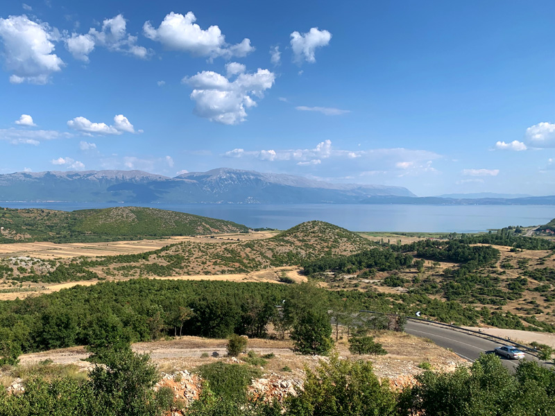 14.Tag, Montag, 8.8.2022 Meine Reise führte mich am Morgen durch Tirana und später durch die Berge Albaniens Richtung Mazedonischer Grenze zum großen Ohrid See, der zur Hälfte Albanien und zur anderen Hälfte zu Nordmazedonien gehört. Tirana zeigte sich als pulsierende Großstadt mit einem großzügigen Stadtkern, Bankgebäuden und Parks sowie geschäftigen Leuten, vielen Ampeln und viel Autoverkehr. Einer der schönsten Reiseabschnitte folgte nun durch die albanischen Berge. Passähnliche Höhenzüge vorbei an Almen, Kühen die die Straße passierten und Schafherden die die einsamen Bergstraßen überquerten. Langsam fahren war aufgrund der teils abgesackten Straßendecke die bessere Wahl. Liegengebliebene Autos überaschten mich nicht mehr. Dennoch fuhr ich durch unberührte Natur die ihres Gleichen sucht und mein Herz war in tiefer Freude. Am späten Nachmittag erreichte ich die nordmazedonische Grenze. Es gab keine große Warteschlange und schon bald war ich an der Reihe und zeigte meinen Reisepass. Der Grenzbeamte allerdings war nicht zufrieden und forderte eine Greencard. Im diesem Moment verstand ich nicht was er mit einer Greencard meinte und assoziierte eine Aufenthaltsgenehmigung. Oder meinte er die grüne Versicherungskarte? Er meinte, nur für 50,- Euro könnte ich eine vierwöchig gültige Greencard erwerben. Nein Danke erwiderte ich und machte ihm klar dass ich wieder zurück nach Albanien fahren würde. Ich drehte also um und umfuhr den See auf der albanischen Seite mit einem kleinen Umweg Richtung Griechenland. Ein wunderschöner Zeltplatz direkt am Ufer des Sees bot mir eine Übernachtungsmöglichkeit. Man servierte mir ein Fischessen von Feinsten und ein ausgedehnter Abendspaziergang am Ufer des Sees schenkte mir anschließend eine entsprechende Bettschwere.