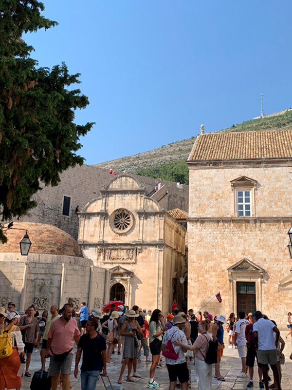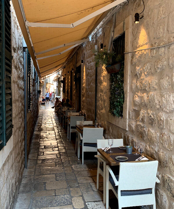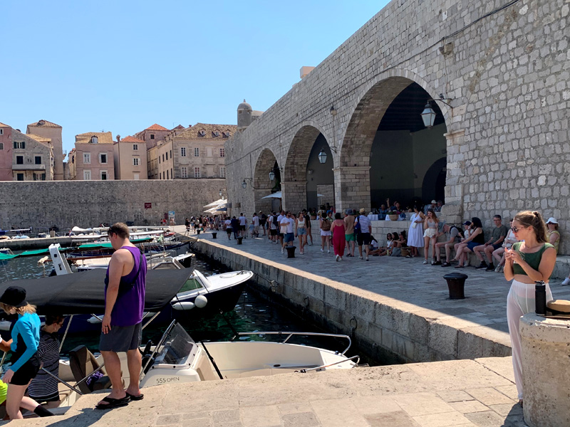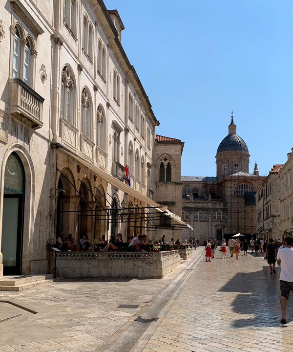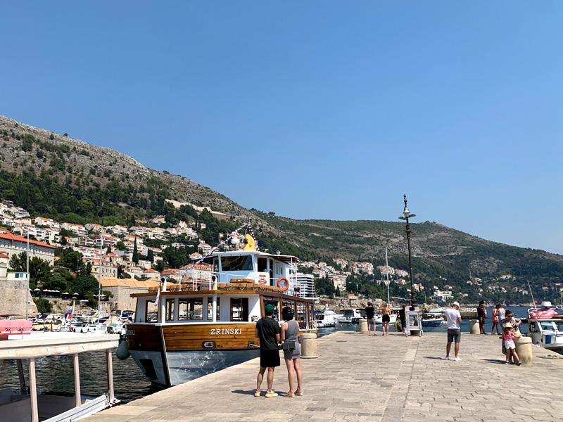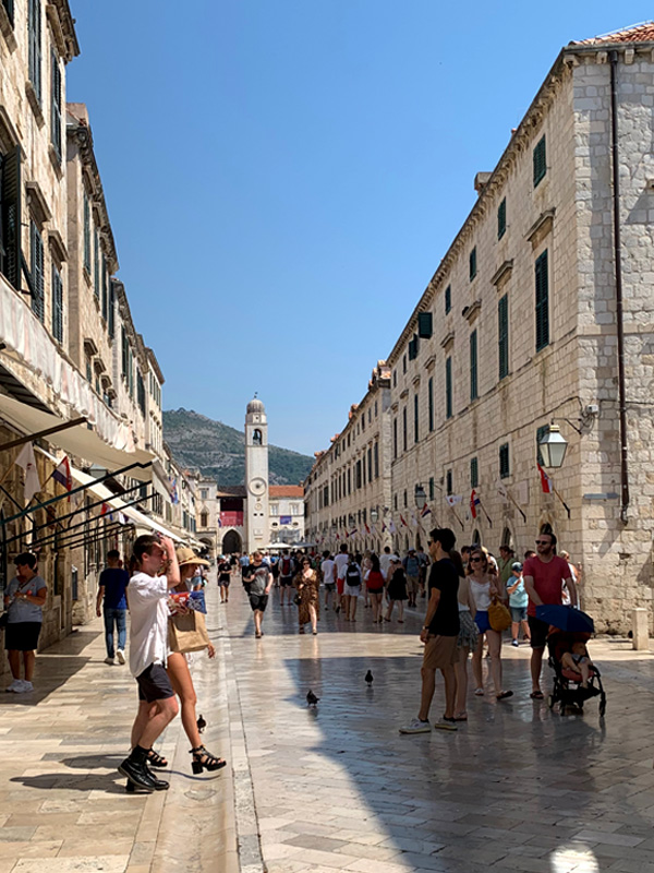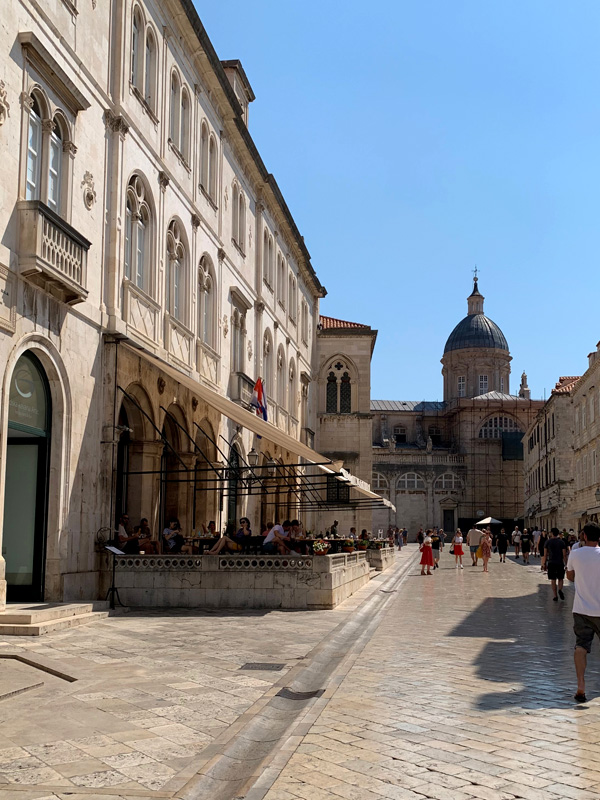 Am elften Tag. Freitag, 05.08.2022 Am Mittag dann fuhr ich mit dem Bus ins ersehnte Dubrovnik, ein kleiner Traum von mir diese Stadt am südlichsten Zipfel von Kroatien einmal zu sehen. Sie sollte mich nicht enttäuschen. Gleich zu Beginn meines Sightseeings habe ich mir ein schönes Frühstück gegönnt. In einem klassisch wirkenden Restaurant bestellte ich einen Kaffee und ein Sandwich. Als mein Essen in Pappboxen serviert wurde antwortete der Kellner peinlich lächenld „fast Food“, and a lot of trash, antwortete ich. Er pflichtete mir bei. Man will halt modern sein in Dubrownik und die von McDonalds erzogene Generation möchte es anscheinend so. Als ich zur Hafenmauer spazierte, lernte ich eine russische Dame kennen die mit der Aida unterwegs war und Freigang in Dubrovnik hatte. Sie erklärte mir wie ich am besten in die Altstadt käme und erzählte mir was sie sich bereits alles angeschaut habe. Etwas abwertend meinte sie, es sehe ja doch alles gleich aus. Sie erwähnte dabei die zahlreichen Souvenier- und Nonsense-shops. Natürlich war die Altstadt völlig überfüllt mit Touristen, das wusste ich, bin dennoch meines Weges gegangen und war hell auf begeistert von dieser alten Architektur die mit nichts zu vergleichen war, was ich bisher auf der Welt gesehen hatte. Marmorböden, Marmorsäulen, alles in beige und hellem Sandstein gehalten, großzügig gestallte Gebäude, herrschaftlich. Weit verzweigte enge Gassen fügten sich den Prachtstraßen an.