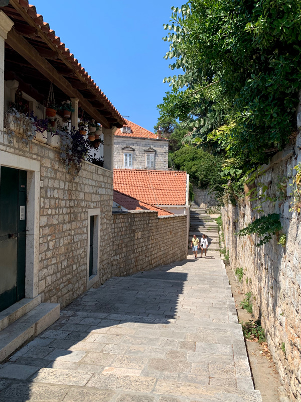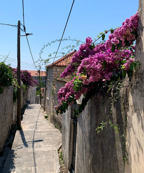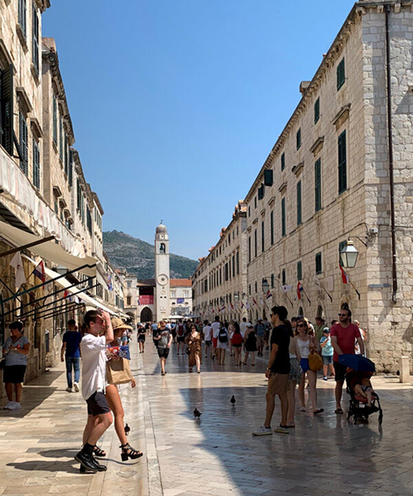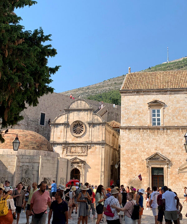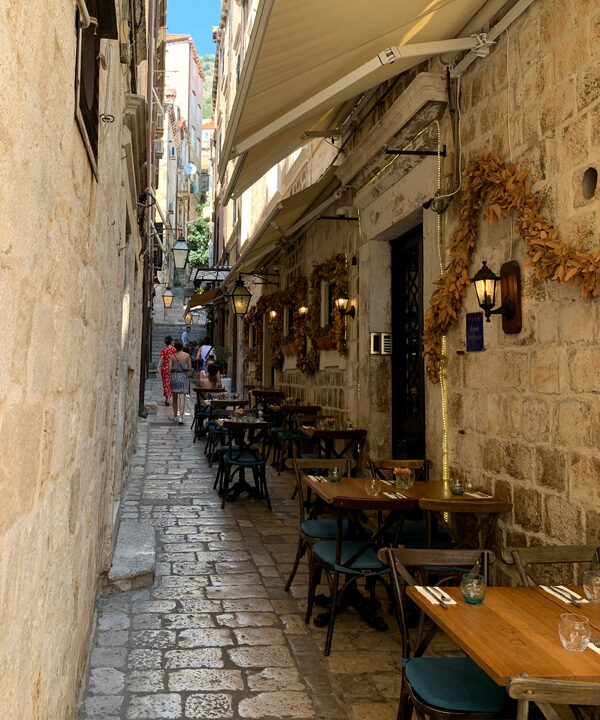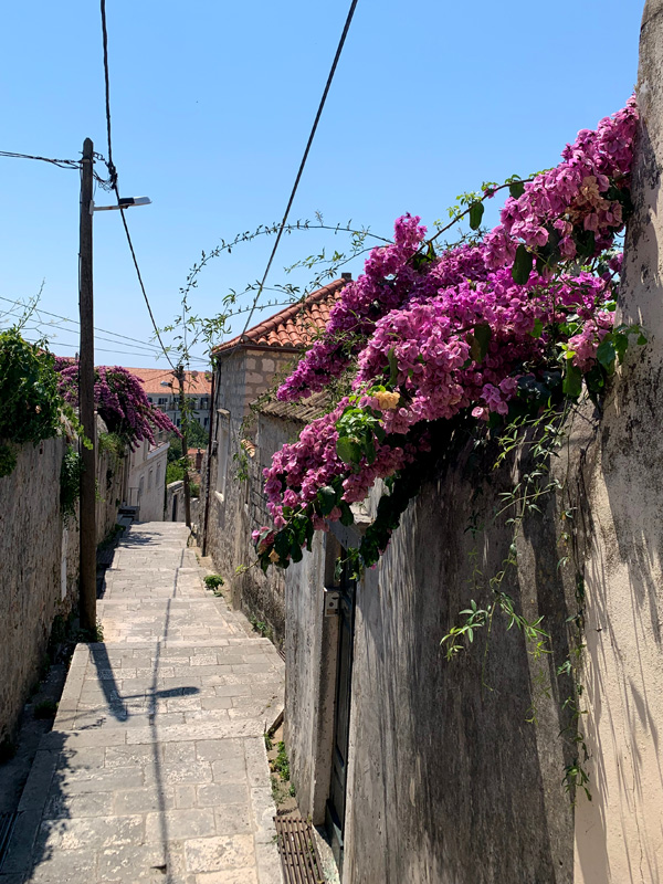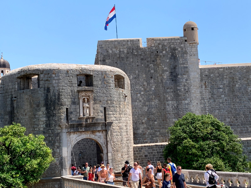 Am elften Tag. Freitag, 05.08.2022 Am Mittag dann fuhr ich mit dem Bus ins ersehnte Dubrovnik, ein kleiner Traum von mir diese Stadt am südlichsten Zipfel von Kroatien einmal zu sehen. Sie sollte mich nicht enttäuschen. Gleich zu Beginn meines Sightseeings habe ich mir ein schönes Frühstück gegönnt. In einem klassisch wirkenden Restaurant bestellte ich einen Kaffee und ein Sandwich. Als mein Essen in Pappboxen serviert wurde antwortete der Kellner peinlich lächenld „fast Food“, and a lot of trash, antwortete ich. Er pflichtete mir bei. Man will halt modern sein in Dubrownik und die von McDonalds erzogene Generation möchte es anscheinend so. Als ich zur Hafenmauer spazierte, lernte ich eine russische Dame kennen die mit der Aida unterwegs war und Freigang in Dubrovnik hatte. Sie erklärte mir wie ich am besten in die Altstadt käme und erzählte mir was sie sich bereits alles angeschaut habe. Etwas abwertend meinte sie, es sehe ja doch alles gleich aus. Sie erwähnte dabei die zahlreichen Souvenier- und Nonsense-shops. Natürlich war die Altstadt völlig überfüllt mit Touristen, das wusste ich, bin dennoch meines Weges gegangen und war hell auf begeistert von dieser alten Architektur die mit nichts zu vergleichen war, was ich bisher auf der Welt gesehen hatte. Marmorböden, Marmorsäulen, alles in beige und hellem Sandstein gehalten, großzügig gestallte Gebäude, herrschaftlich. Weit verzweigte enge Gassen fügten sich den Prachtstraßen an.