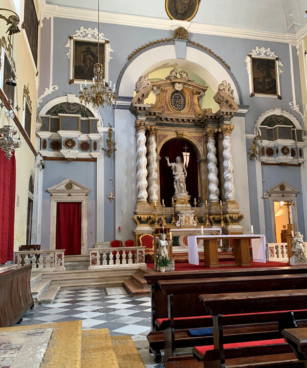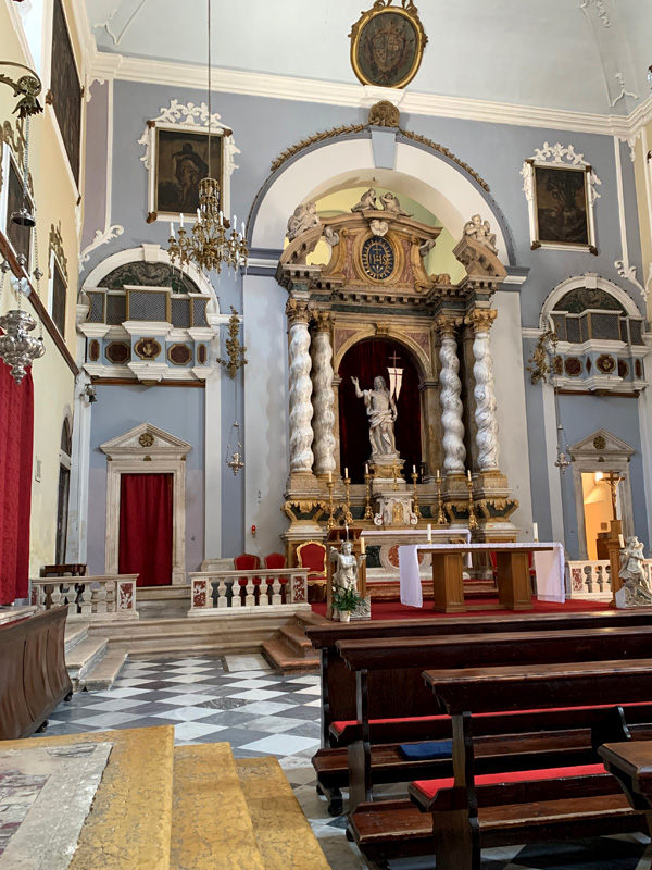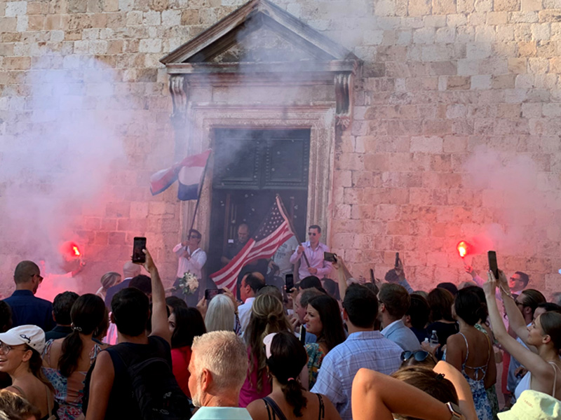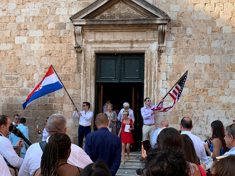 Die Sonne in den frühen Nachmittagsstunden war unerträglich und so suchte ich Zuflucht in einer wunderschön gestalteten Kirtche. Eine freundliche Dame am Eingang flüsterte mir zu, dass um 17:00 Uhr eine Trauung stattfinden würde, wenn ich vielleicht Lust hätte daran teilzunehmen und wies mir die hinteren Plätze zu. Das wollte ich mir nicht entgehen lassen und war pünktlich nach einem schönen Hafenspaziergang zurück. Es wurde eine Kroatisch-amerikanische Hochzeit zelebriert. Alle waren so festlich gekleidet und ich kam mir mit meinem leigeren Sommerlook etwas Fehl am Platz vor. Ein Gottesdienst nach streng katholischer Ordnung fand statt. Lesungen von Tanten und Onkels, ein Geigensnsemble und eine wunderschöne Altistin verschönerten die Feier. Zum Abschluß wurde draußen ein kleines Feuerwerk mit bengalischen Fackeln gegeben. In der Altstadt in einer kleinen Seitengasse genoss ich noch ein leckeres Fischgericht mit Salat und leckerem Bier und fuhr dann zurück mit dem Bus auf meinen schönen Zeltplatz. Es war zwar nicht ganz leicht die Bushaltestelle zurück zu finden, mit Englisch kam ich nicht wirklich weiter, aber irgendjemand weiß immer irgendwie Bescheid und weist einem den Weg. Dann fuhr der Bus auch noch am Zeltplatz vorbei, stoppte dann aber etwas später. Glücklich und müde kroch ich in mein kleines Zelt.