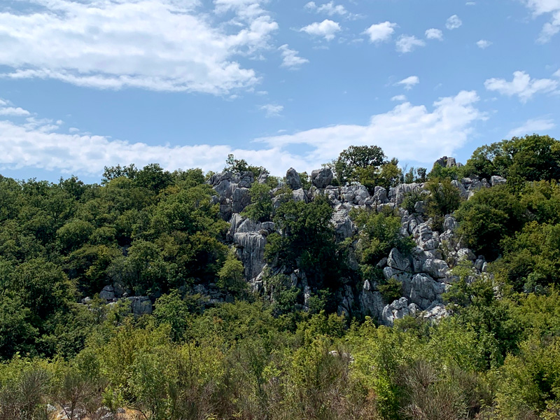 Der siebte Tag. Montag, 01.08.2022 Von Triest aus startete ich auf einer Landstraße über die Berge Richtung Slowenien. Leider hatte meine Fahrt ein jähes Ende. Ein großer Waldbrand war der Grund. In einiger Entfernung sah ich schwarze Rauchschwaden aufsteigen und die Feuerwehr hatte bereits alle Zugangsstraßen abgesperrt. Die Wälder brennen zu sehen machte mich traurig. Wie das Feuer in rasendem Atem in Sekunden hinwegrafft was über Jahrzehnete gewachsen ist. Ich musste wieder umkehren. Die Sommerhitze hinterließ ihre Spuren. Auch im weiteren Verlauf musste ich meine Route ändern. Diesmal war eine Baustelle der Grund. Mittags erreichte ich die slowenische Grenze. Die Grenzkontrollen verursachten einen zu langen Stau. Als ich endlich dran war und meine Papiere schon griffbereit hatte, winkte der Beamte mich einfach durch. Wie schön, ich war dankbar dass ich diese Grenze ohne Coronanachweise passieren konnte. Mein Weg führte mich durch den nicht enden wollenden slowenischen Wald. Selten habe ich ein Land gesehen dass so viel gesunden Wald vorweisen kann. Eine kleine beschauliche Landstraße, vorbei an einigen kleinen Dörfern, schlängelte sich hindurch durch Wald und Wiesen. Bald erreichte ich das schöne Rijeka. Zwar standen viele alte herrschaftliche Häuser im Zentrum, doch leider waren die Fassaden lange nicht mehr renoviert worden und das Stadtbild war in einem schlechten Zustand. Der Sozialismus hatte seine Spuren hinterlassen. Am frühen Nachmittag, endlich in Kroatien angekommen machte ich an einem kleinen Bahnhof halt und gönnte mir ein paar frische Früchte von einer jungen Obstverkäuferin am Straßenrand. Sie sprach fließend Englisch und zeigte mir freundlich die Richtung zur kroatischen Küstenstraße. Bald hatte ich das Mittelmeer erreicht und konnte es kaum aushalten nicht schwimmen zu gehen. Mir bereits Tage vorher aufgefallen, dass ich meine Badehose vergessen hatte einzupacken. Ich fand einen kleinen Uferweg, stellte mein Motorrad ab entkleidete mich bis auf die Unterhose und stieg die Felsen hinab zum Wasser hinunter. Als ich den steinigen Strand erreichte lag dort eine wunderschöne Frau, barbusig, ein Sonnenbad nehmend. Ich versuchte ihr gestikulierend klarzumachen dass ich sie nicht stören wolle sondern einfach nur ins Wasser springen wolle. Ich schämte mich so sehr nur in einer Unterhose gekleidet zu sein. Sie willigte ganz natürlich ein und ich sprang nackt ins klare Wasser. Herrlich, doch war das Wasser noch ganz schön kalt und ich schnaufte und pustete so vor mich hin. Ich war glücklich. Das Wasser war glasklar und erfrischend.